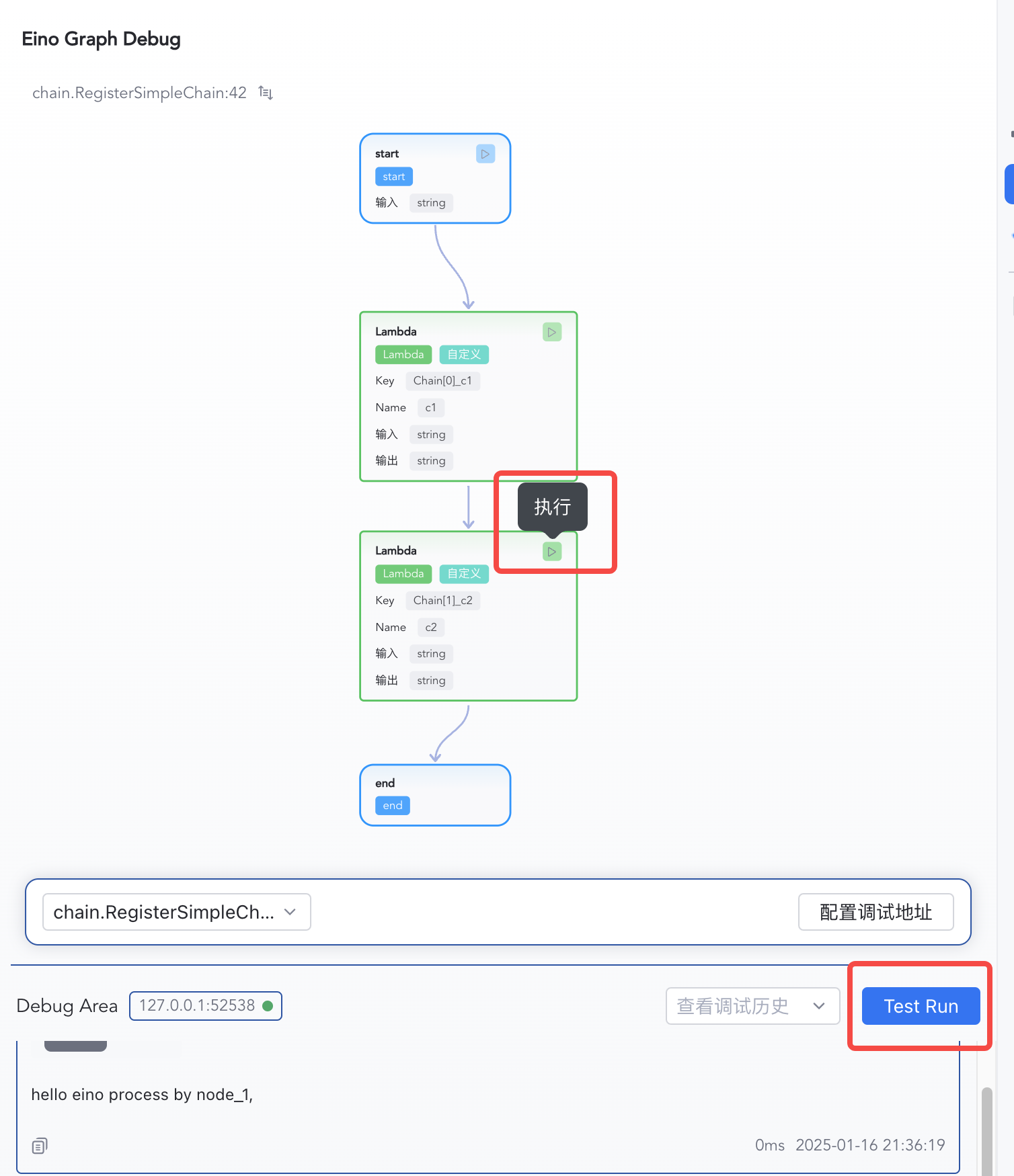1) Click “Test Run” to start from START 2) Enter "hello eino" and confirm