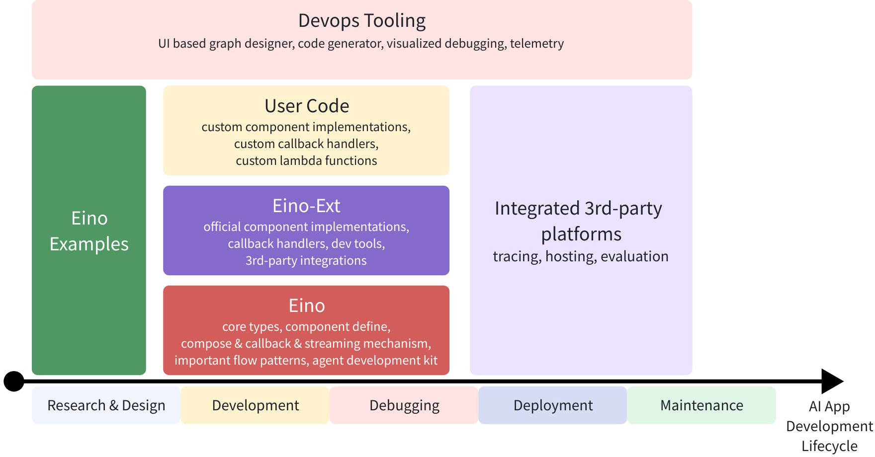 With these capabilities and tools, Eino can standardize, simplify operations, and improve efficiency at different stages of the AI application development lifecycle: